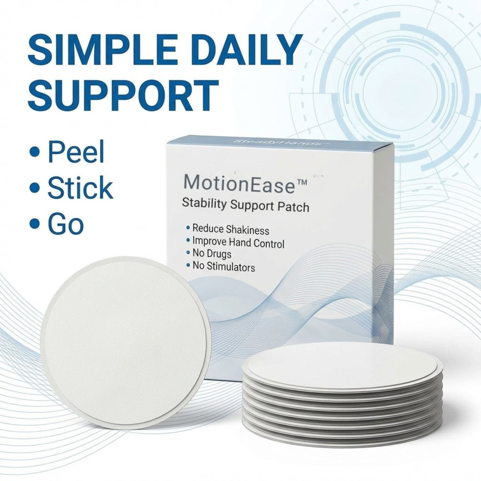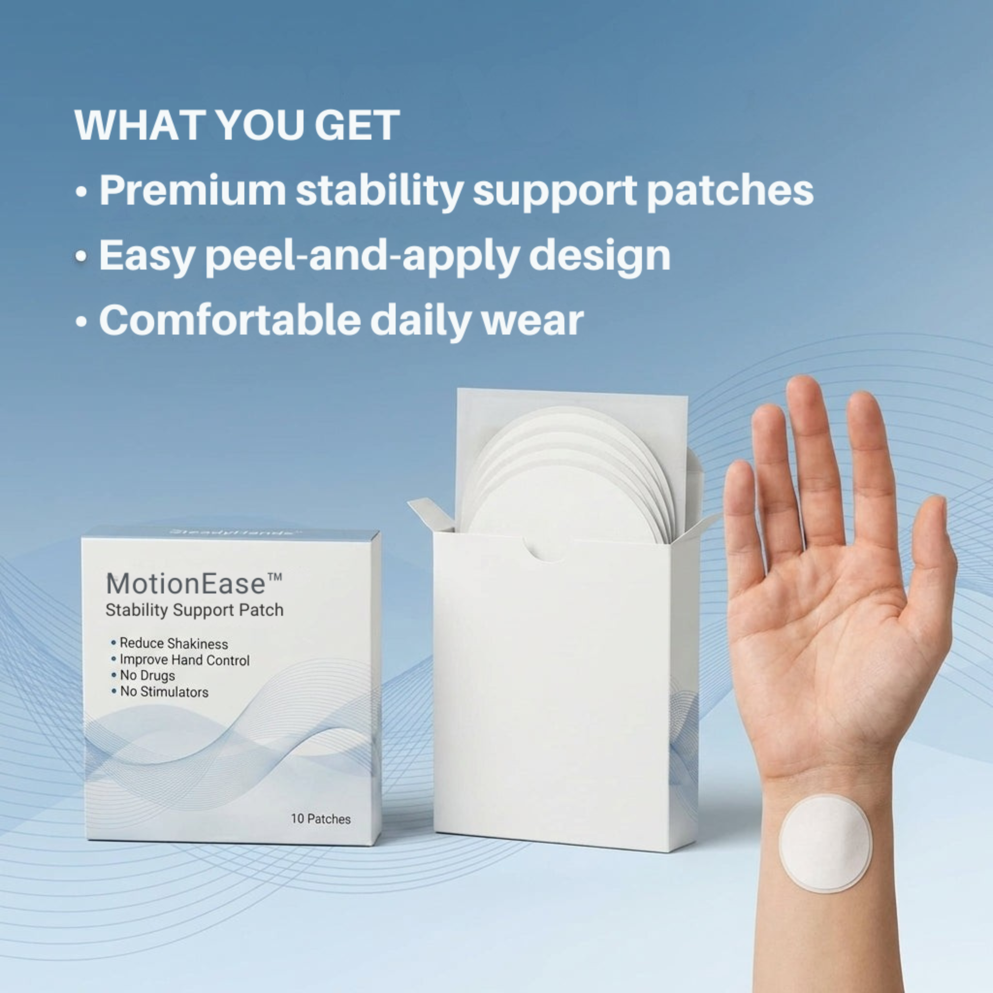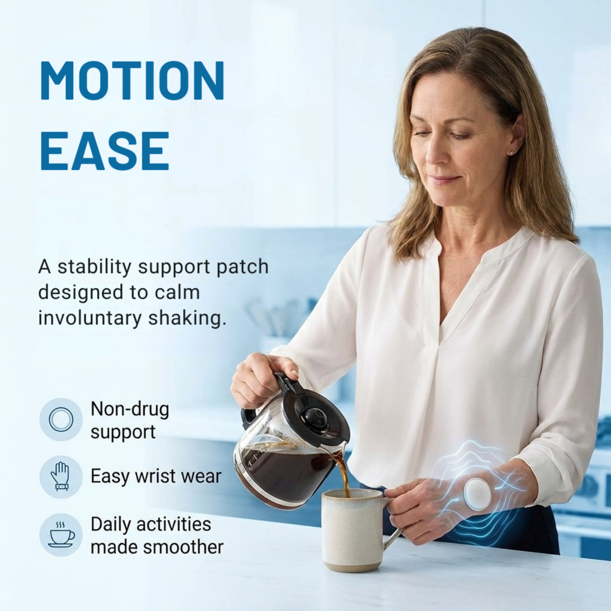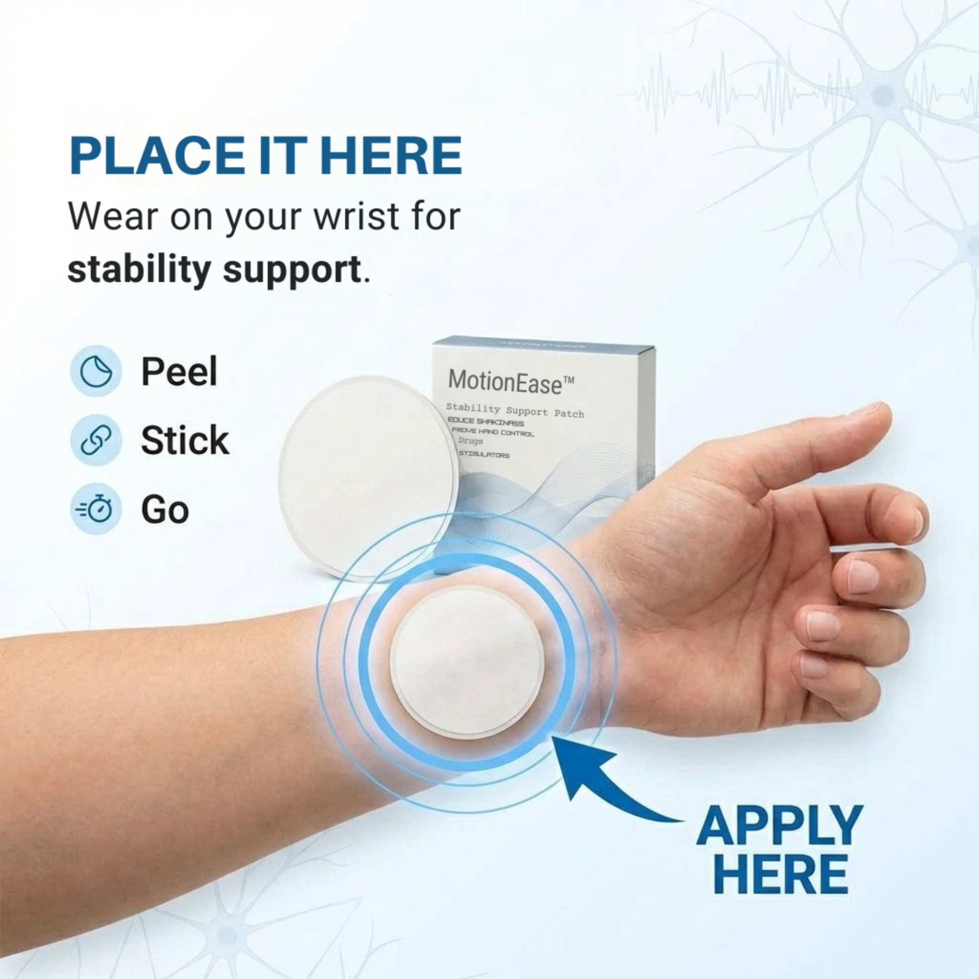 The MotionEase Stability Support Patch is designed to interact passively with the body’s natural bioelectrical activity, helping support stable hand movement through non-invasive, drug-free technology.