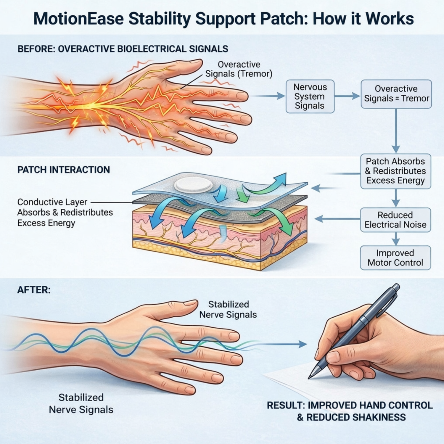 The MotionEase Stability Support patch interacts with the body’s natural bioelectrical activity at the surface of the skin. It helps absorb and redistribute excess electrical noise, supporting calmer neuromuscular signaling and steadier hand movement.